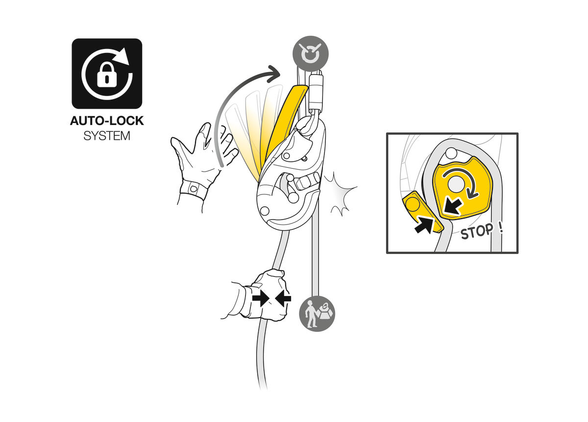 – Sistema AUTO-LOCK que permite posicionarse fácilmente en el lugar de trabajo, sin tener que manipular la empuñadura ni realizar una llave de bloqueo: desde que el usuario suelta la empuñadura, la cuerda queda automáticamente bloqueada en el aparato. El retroceso automático de la empuñadura limita los riesgos de enganche involuntario.